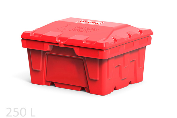 Первое, что следует отметить – объем подобных контейнеров может быть равен 0,25 или 0,5 м3. Они отличаются морозостойкостью и ударопрочностью. К тому же пластиковые ящики для пескосоляной смеси обладают и другими преимуществами по сравнению с аналогами из металла, бочками и прочими видами емкостей.